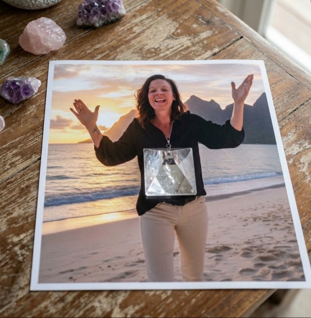 2. Placement de la pyramide : On place la pyramide en quartz sur la photo au niveau de la zone à amplifier. La pyramide n’est pas un hasard pour accompagner une guérison d’une zone du corps. La géométrie Sacrée est le langage de la Création. C’est « une antenne cosmique », sa pointe (l’apex) capte l’énergie subtile de l’Univers pour les concentrer en son centre. « L’Amplification du cristal », lorsqu’elle est en quartz, la pyramide ne se contente pas de recevoir, elle amplifie. Elle agit comme un haut-parleur pour l’intention que tu envoies. « L’Onde de Forme », sa base carrée l’ancre dans la matière, le corps, la machine humaine. Ses faces triangulaires élèvent la vibration.